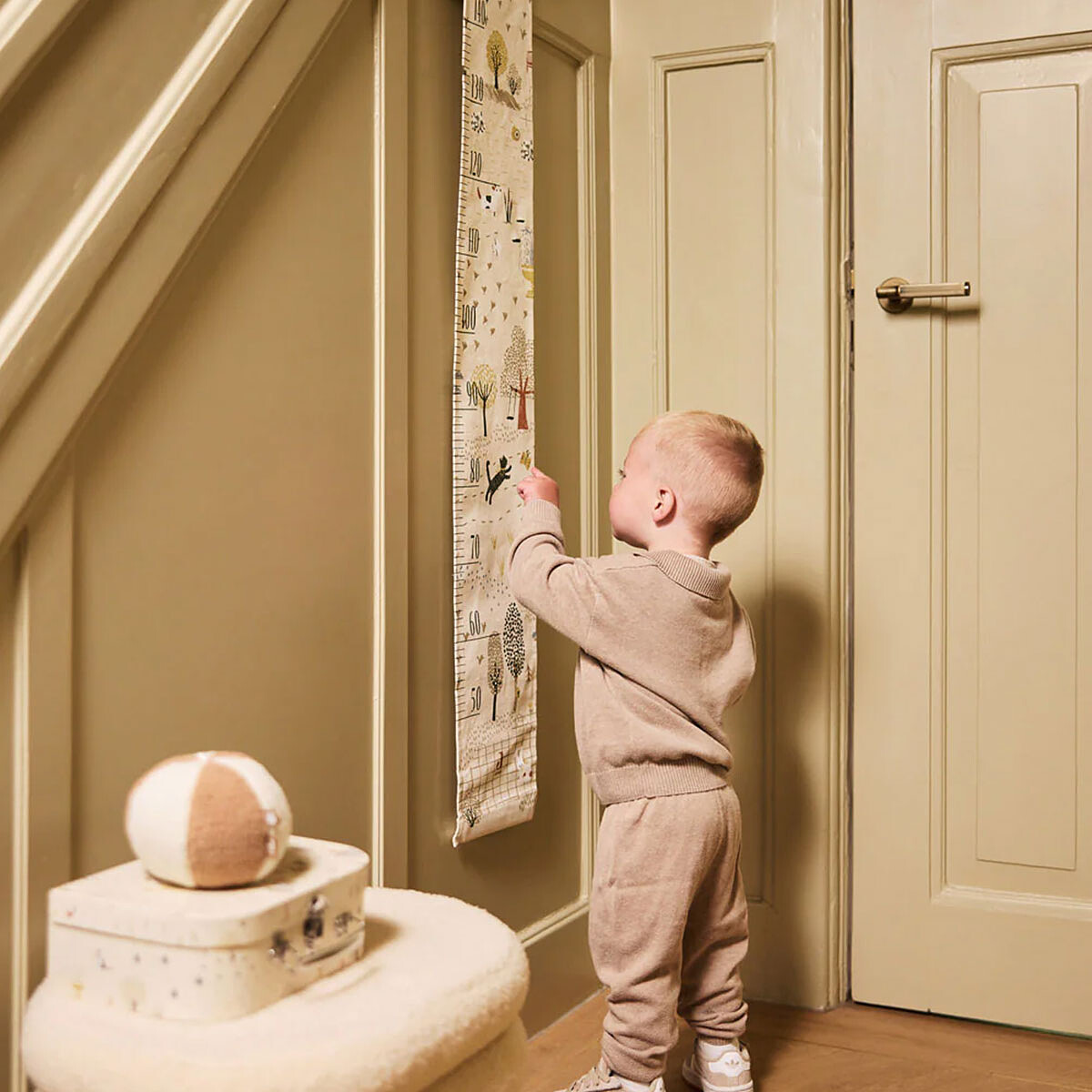 Pensée pour accompagner les premières années, cette toise permettra de mesurer votre enfant de 50 à 110 cm. Au moment de s’habiller le matin ou avant l’histoire du soir, il ou elle viendra se placer contre le mur, et vous noterez ensemble les centimètres gagnés. Un rituel facile à instaurer qui favorisera la curiosité et l’autonomie autour de son propre corps.
