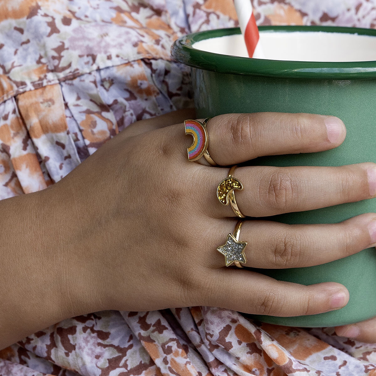 Le lot réunit trois formes faciles à reconnaître : lune, arc-en-ciel et étoile. Les petits détails attirent l’œil et encouragent l’expression de la personnalité, selon l’envie du moment. Lors d’un jeu d’imitation ou d’un atelier “tenue du jour”, votre enfant choisira sa bague et gagnera en autonomie en apprenant à la mettre et à l’enlever seul·e.