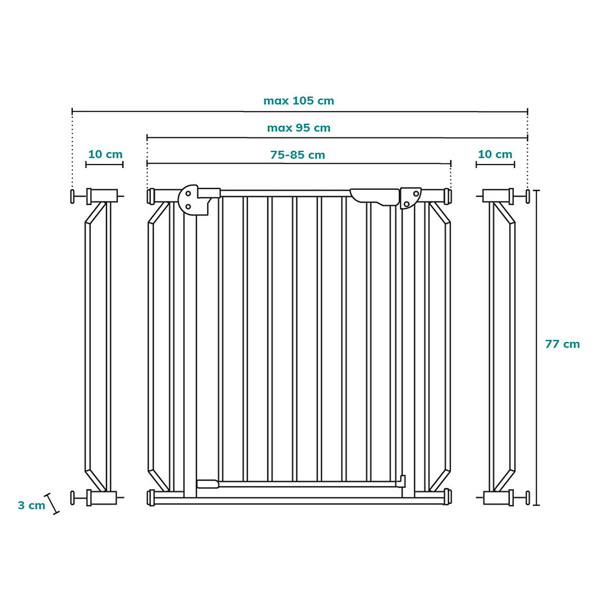 Pensée pour s’adapter, cette barrière conviendra aux ouvertures de 75 à 105 cm. Vous ajusterez l’installation selon votre configuration, et la structure restera discrète grâce à son format Slim. Au moment de passer les bras chargés, le portillon s’ouvrira dans les deux sens pour faciliter la circulation. Côté enfant, le mécanisme restera volontairement difficile à manipuler, pour une sécurité renforcée.