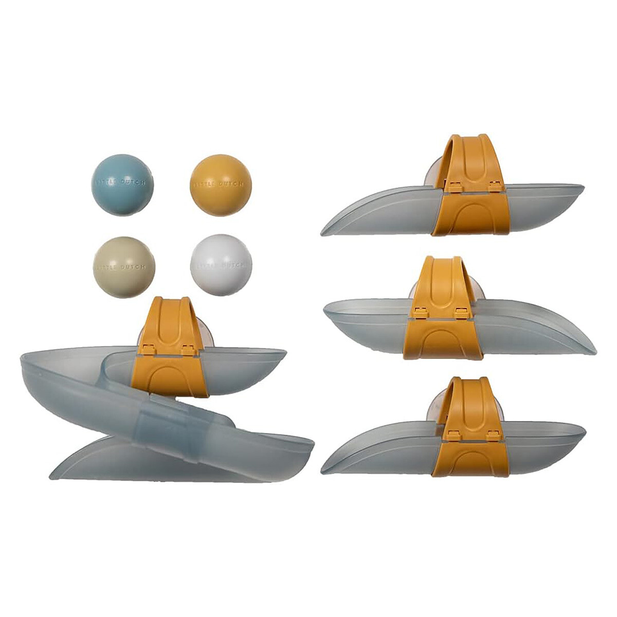 Avec le Circuit de Bain avec Balles - Blue Little Dutch, l’heure du bain deviendra un moment de découverte et de rires. Il suffira de fixer les 3 toboggans à ventouses sur la paroi de la baignoire ou de la douche, puis de laisser glisser les balles pour observer leur course… et les petites éclaboussures qui suivent. Un rituel simple à mettre en place, idéal pour occuper bébé pendant la toilette.