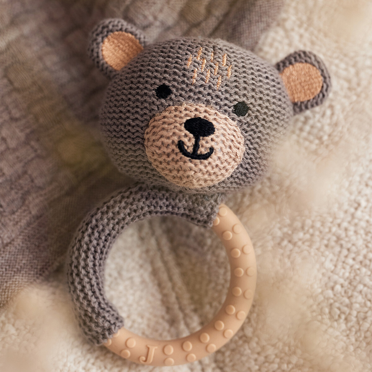 Pensé aussi pour l’éveil, ce hochet en forme d’ours gardera l’intérêt de bébé une fois la gêne calmée. En le secouant, votre enfant déclenchera un doux tintement : une petite cloche est intégrée à l’intérieur de la peluche. Cette surprise sonore encouragera la curiosité et la coordination main-bouche, tout en offrant un jeu simple et accessible dès les premières explorations.