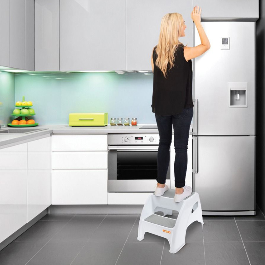 Pensé pour une utilisation familiale, ce marchepied dispose de deux marches avec revêtement texturé antidérapant qui limitera les glissades, même quand les pieds sont humides. Son assise au sol est renforcée par quatre larges pieds équipés de patins antidérapants : idéal pour se brosser les dents, aider en cuisine ou accéder à une étagère basse sans que le marchepied ne bouge.