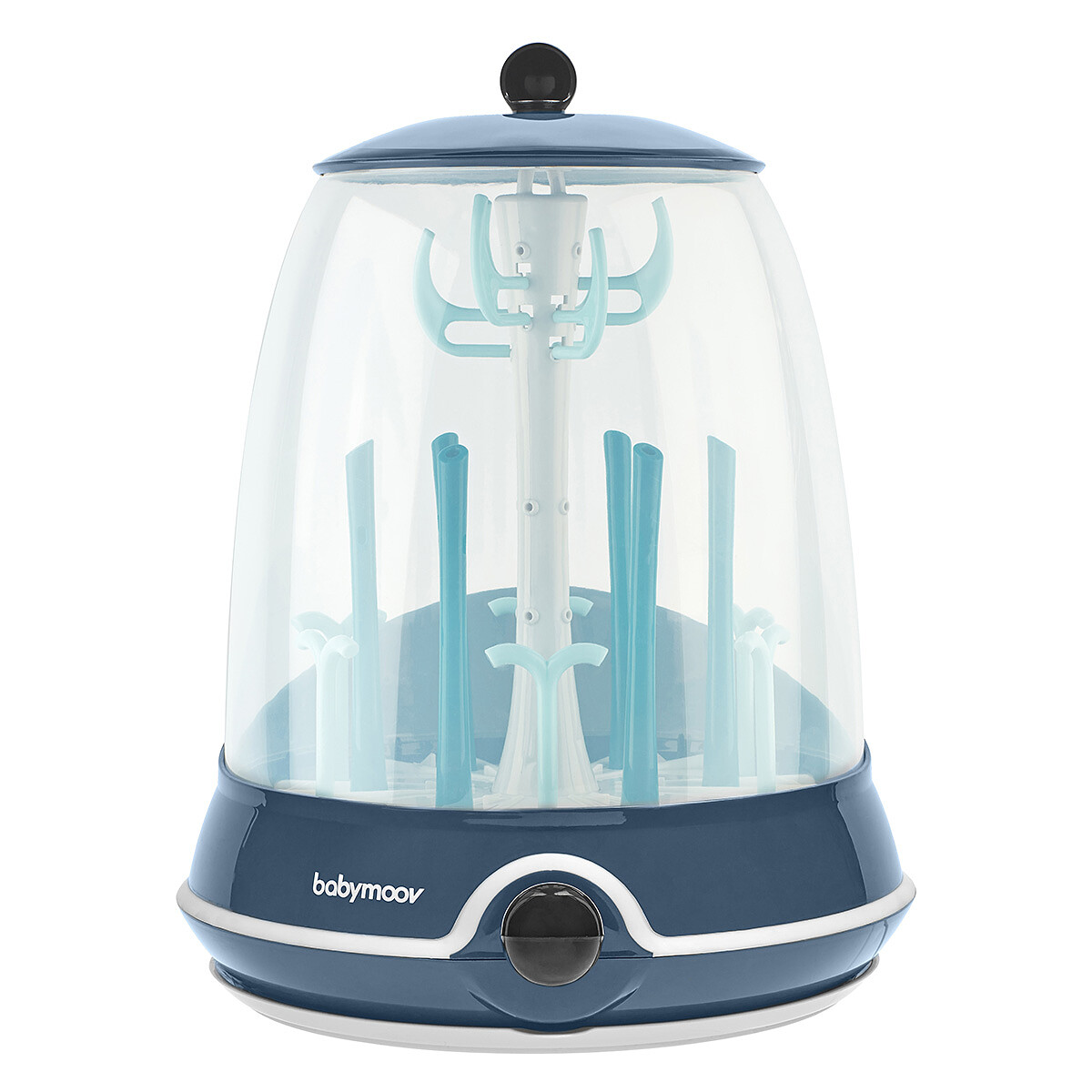 Son utilisation restera simple : un bouton central lancera la stérilisation, puis une alarme signalera la fin du programme. L’appareil s’arrêtera automatiquement afin d’aider à économiser l’énergie. Les tiges amovibles vous permettront de moduler l’espace, et le plateau se retirera pour servir d’égouttoir où vous le souhaitez. Côté entretien, plateau, tiges et cloche passeront au lave-vaisselle.