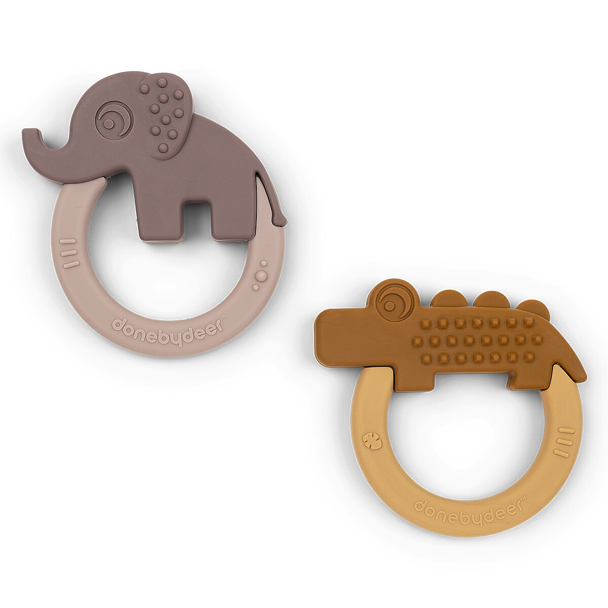Avec le lot de 2 anneaux de dentition Deer Friends Done by Deer, bébé aura toujours de quoi se soulager, à la maison comme en sortie. Les formes d’Elphee l’éléphant et de Croco le crocodile sont pensées pour les petites mains : la prise en main sera naturelle, même lors des premières explorations. Vous glisserez simplement un anneau dans le sac à langer pour garder une solution apaisante à portée de main.