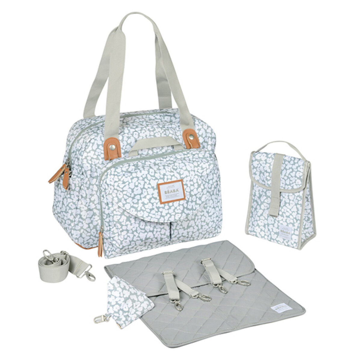 - Inclus : bandoulière amovible, pochette repas isotherme, mousquetons, trousse de rangement, protection pour sucette, matelas à langer amovible