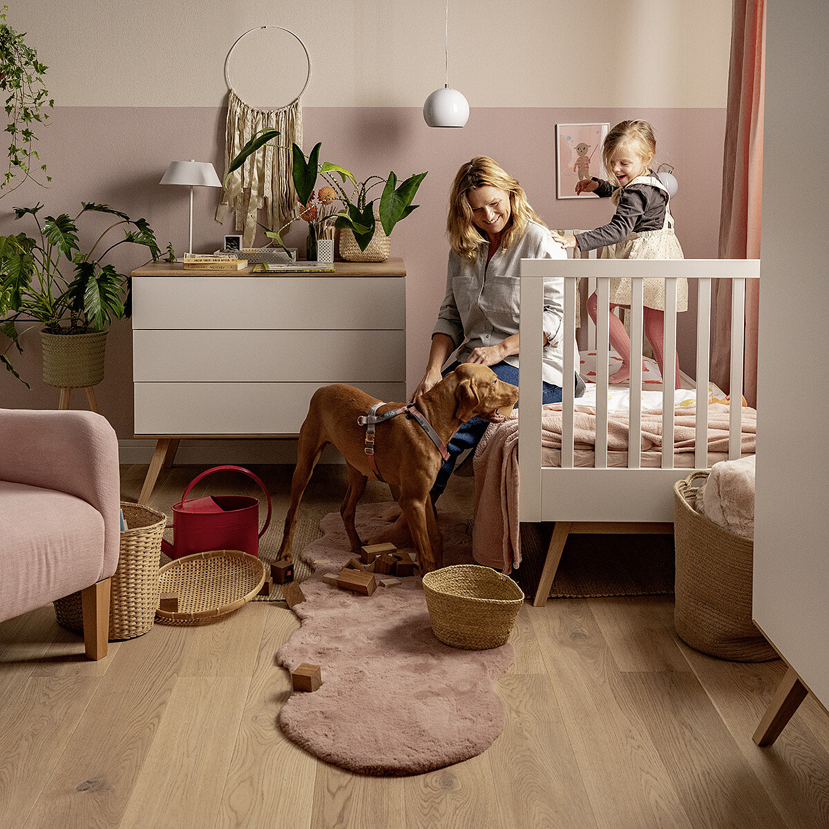 Quand votre enfant commencera à gagner en autonomie, le lit se transformera en lit junior : il suffira d’enlever les deux panneaux latéraux. Vous prolongerez ainsi l’usage du mobilier, tout en aidant votre enfant à entrer et sortir plus facilement pour les rituels du soir, les lectures et les matins tout doux. Conçu en chêne et MDF, il accompagnera la vie de famille durablement.