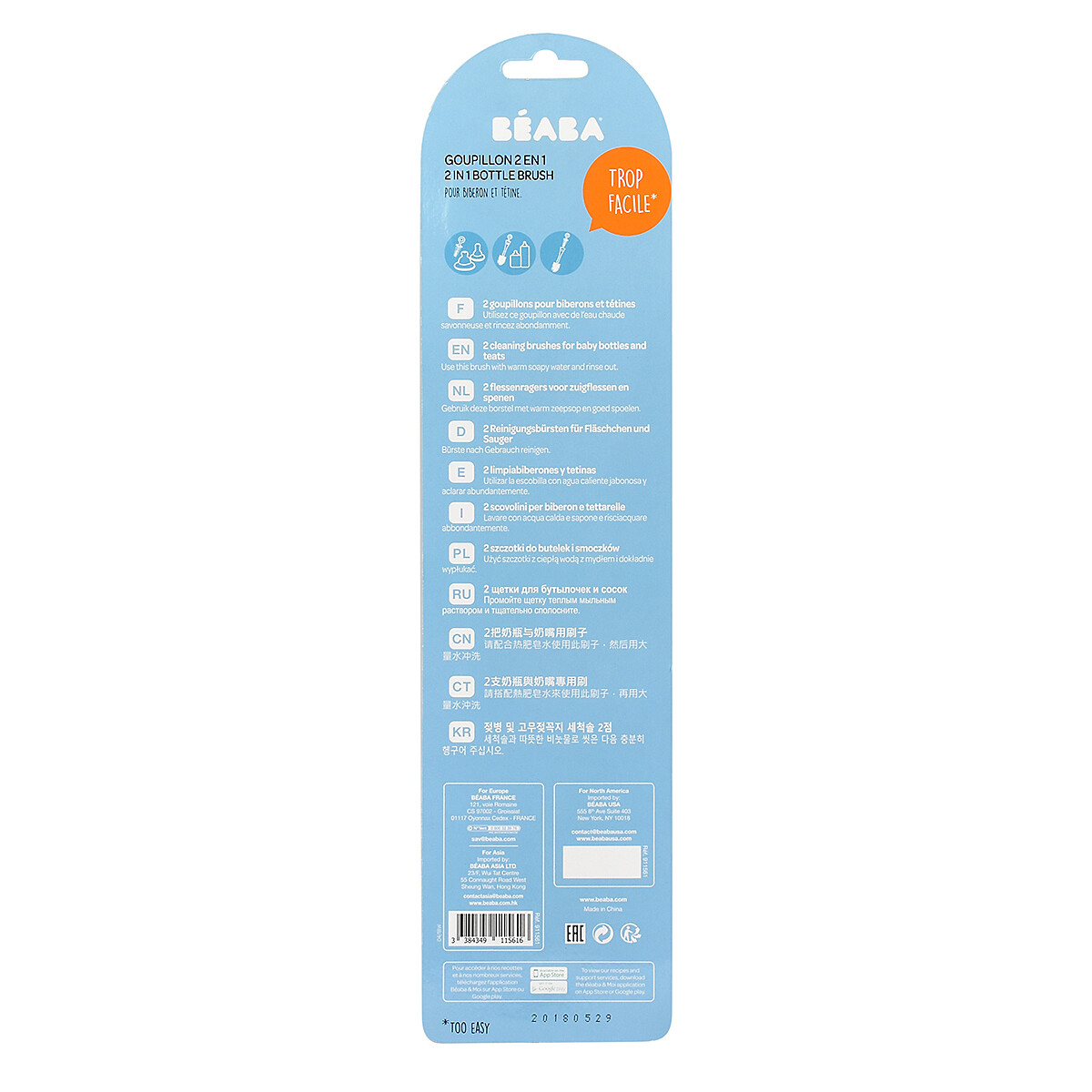Pratique au rangement, le petit goupillon s’emboîte dans le grand pour un gain de place appréciable. Conçu sans BPA, il répond aux attentes des familles attentives aux matériaux au contact des accessoires bébé. Son lavage à la main permettra de garder l’outil propre et prêt à l’emploi, jour après jour.